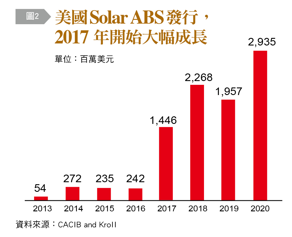 美國太陽能金融資產證券化商品(簡稱Solar ABS),是為其住宅屋頂型太陽能產業的債務融資主要來源之一,自2013年累計至2020年以來,已成功完成42筆太陽能ABS交易,有來自不同規模、期限和信用等級,總發行量超過94億美元的金融資產證券化商品。由〔圖2]可知,美國Solar ABS的發行,從2017年開始已經有了大幅度成長。
