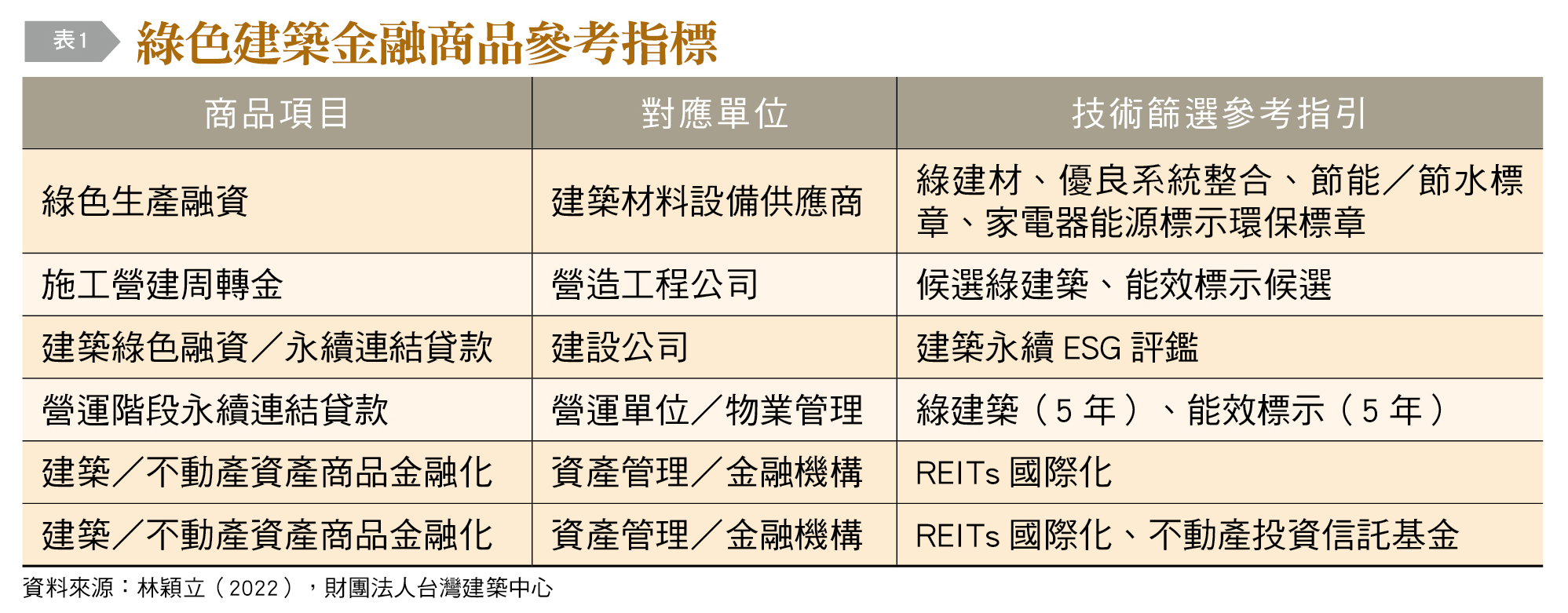 為支應建築低碳活動進行所需龐大專案資金,金融機構可參考由國際資本市場協會(ICMA)所彙整,依據建築物類型(商辦大樓或住宅型房舍)及屬性(新建物或既有老舊建築物)分類,國際金融機構已規劃各類型綠色金融商品可運用於建築業投資、授信融資商品,如〔表1〕: