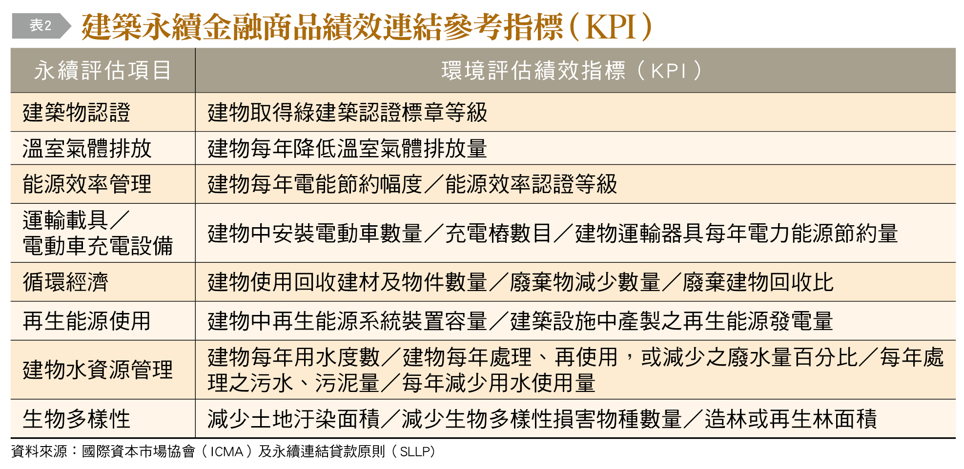 永續連結債券/貸款商品設計目的在於協助建築專案籌融資,支應建築營建資金需求,商品設計需能連結至績效考核指標(KPI)〔表2〕,檢視該金融商品發行者商業模式是否符合永續目標。在永續績效目標達成上,須能與金融商品發行者永續策略具一致性。
