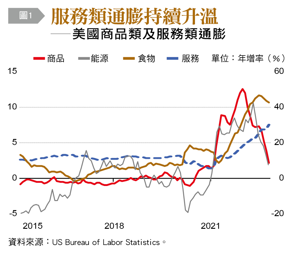 以房租而言,2022年12月年增率已達7.5%。但是,考量房貸利率較2021年底至少多出3%至3.5%,且房價從2022年中迄今回落逾3%,未來仍有下滑空間,加上新承作房租的年增率續降,預期未來數月整體房租的年增率應可見高轉弱。而聯準會最關注的核心PCE(個人消費支出物價指數)通膨,其占比逾半的服務類,基本上與薪資有較明顯的連動(Powell 2022)。