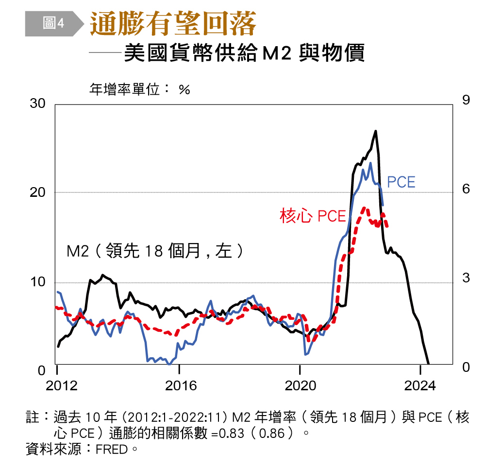 整體而言,美國通膨趨勢較可能朝緩落發展。從Friedman的名言「通膨不脫貨幣現象」來看,美國目前的貨幣供給M2年成長率已近負值,在貨幣政策有明顯的遞延效應下,通膨亦可能出現相同的發展〔圖4]。倘供應鏈無重大衝擊,且油價在每桶70至90美元區間,我們預估通膨應在年中回落至4.5%以下(PCE通膨會更低),而到年底則至3.5%以下。儘管離美國2%的通膨目標區仍有差距,但若聯準會在2月1日及3月22日各升1碼,代表政策利率的水準將從目前的4.5%升至5%。也就是很可能在第2季,名目政策利率水準將大於通膨,實質政策利率水準(這邊定義為名目利率減PCE通膨)由負翻正。