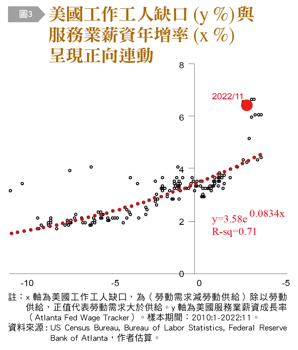 缺口大,意味著薪資壓力的上揚,以不同指標衡量,目前薪資成長率約在4.5%至6.5%。〔圖3]是2010年至2022年,美國各月工作工人缺口〔(勞動需求減勞動供給)除以勞工供給〕與服務業薪資年增率的關係,大致呈正向連動。在勞動力短期不易出現大幅改善的情況下,勞動需求特別是職缺變化遂成關鍵。從2022年2月至11月,職缺數減少近140萬個。倘景氣持續走緩,應可見未來數季職缺進一步減少,有助於薪資壓力的減輕。但短期上,服務業的薪資成長恐仍在高位,服務類的通膨走緩還需一段時間。而就大趨勢上來看,薪資水準在未來數年偏上發展的態勢則是有增無減。