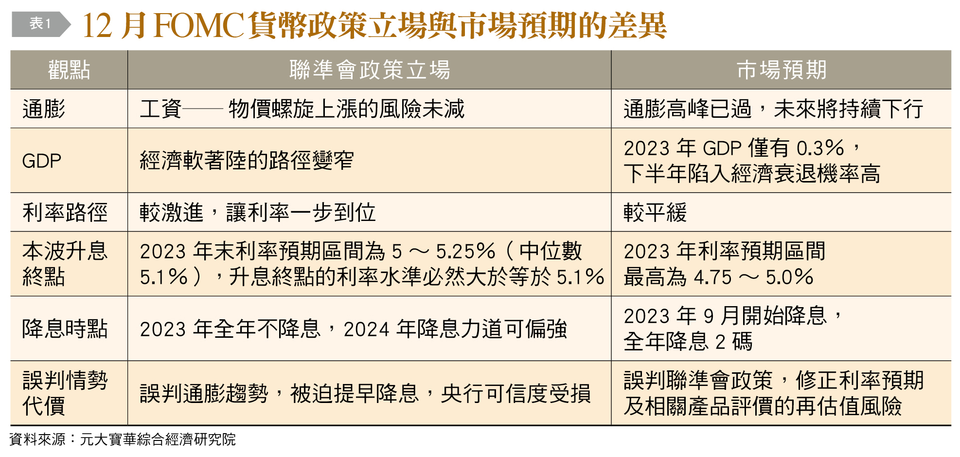 對聯準會而言,考量到具僵固性的服務類價格還有相當的支撐力量,且就業市場依舊非常緊張、薪資成長快速,工資――物價螺旋上漲的風險未減等情勢下,即便近期通膨數據出現明顯回落趨勢,聯準會仍於12月會期再度上修通膨、利率預期,同時下修經濟成長表現。其中,2023年末利率預期區間上修到5%至5.25%(中位數5.1%,升息終點的利率水準甚至可能大於5.1%),比市場預期來得高1碼。該會期的會議紀錄更清楚指出,「沒有官員預測2023年底前會調降聯邦資金利率」。