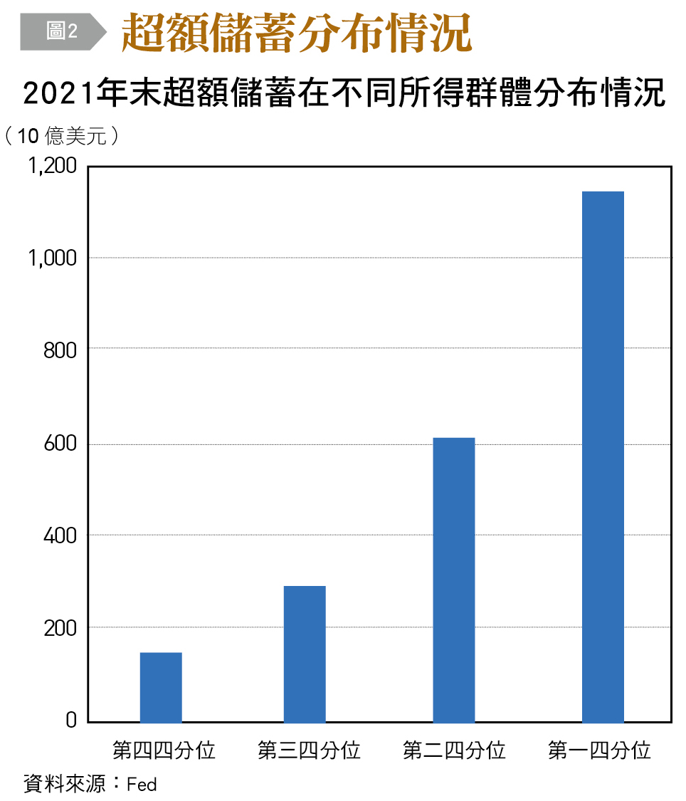參照聯準會報告,高所得家庭擁有較高的超額儲蓄,但高所得家庭因邊際消費傾向降低,超額儲蓄增加帶動的消費增幅也較低〔圖2]。因此,在考量超額儲蓄結構分布後,預料情境三出現的機率較高,亦即超額儲蓄對消費的支持力量將在今年第3季耗盡。