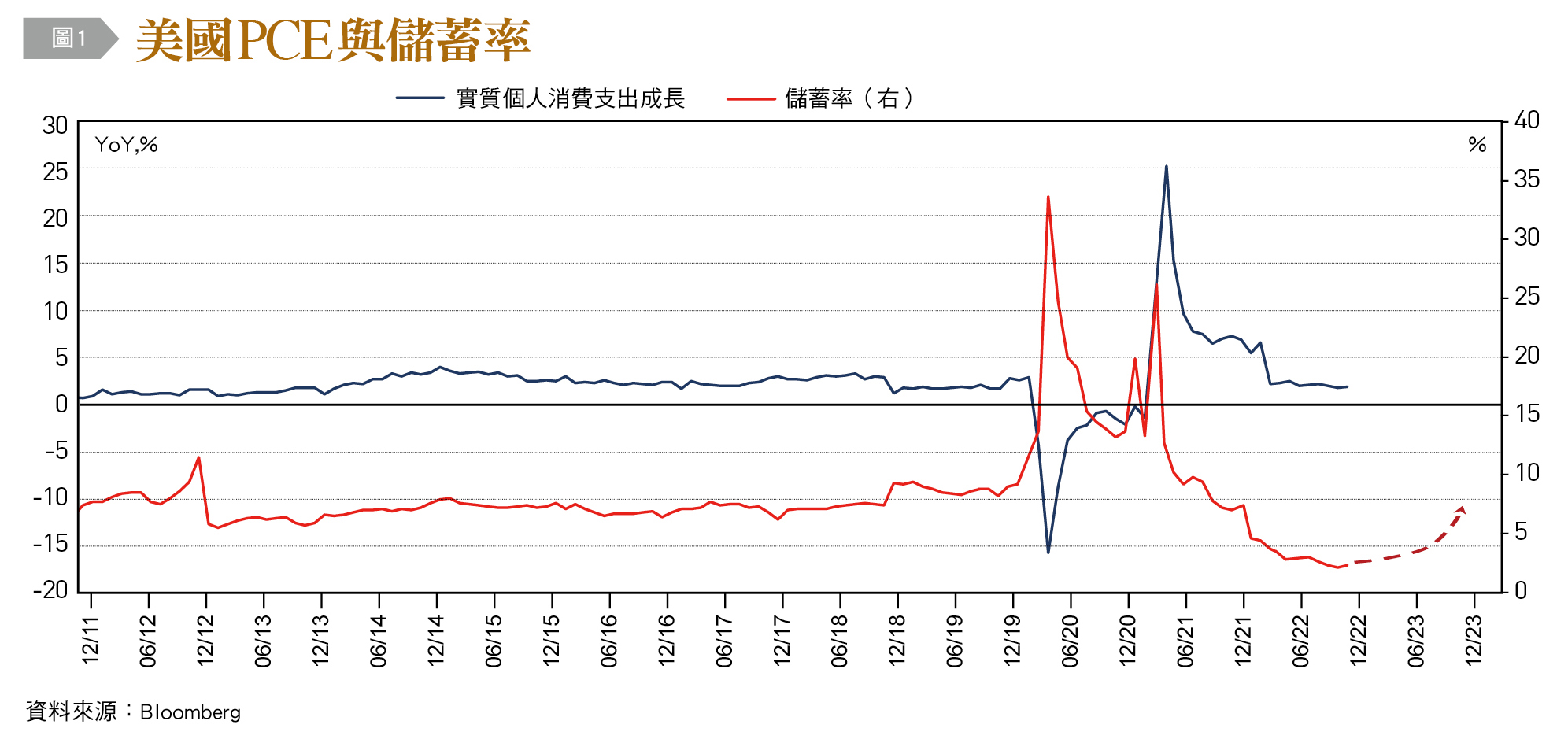 美國消費動能之所以強勁,主要是疫情期間美國政府推出了史上最大規模的紓困政策,大量的政府轉移支付提高了家庭收入,但疫情造成的供給中斷或採購不便,使家庭支出嚴重縮減,且降息及學貸赦免等措施導致家庭利息支出大減,均讓家庭儲蓄大幅增加,遠高於平均水準〔圖1]。聯準會研究顯示,2021年末美國家庭累積超額儲蓄(Excess Savings)達到2.3兆美元,為該年總GDP的一成。2022年美國經濟活動逐漸走回正軌後,這些大量的超額儲蓄便形成龐大的消費力量。
