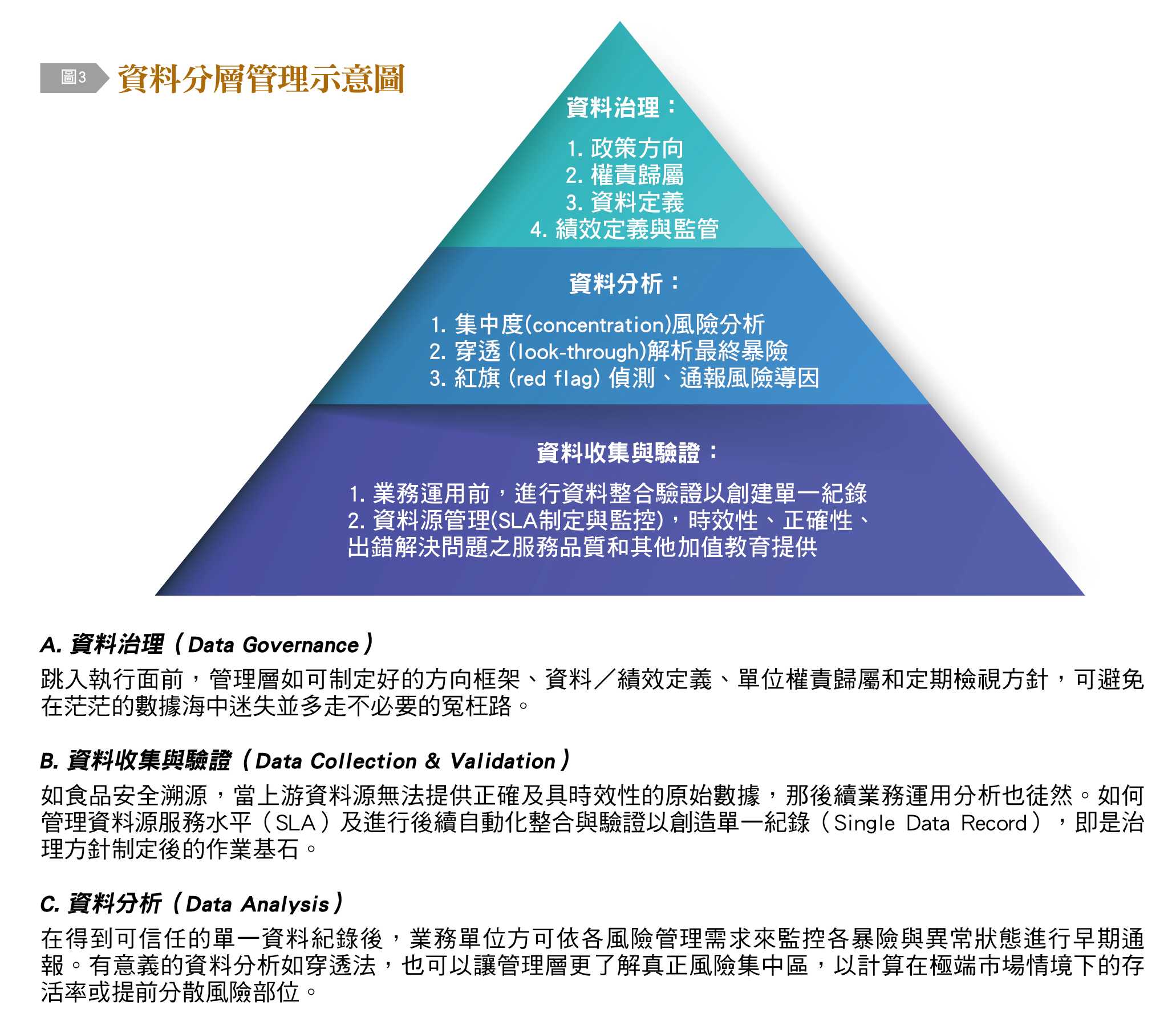 不難想見,要有效測量、配置到控管所有投資相關風險因子,我們必須收集、整合大量與不同類型資料並將其數位化,以達到即時性要求,但因資料來源繁多、定義不同,相信讀者也有過不識廬山真面目,只緣身在此山中的感覺。投資機構不論規模大小,如果有完整的資料治理文化,就有契機提早發現風險偏離值而盡速處理。筆者也在此提供資料分層管理概念分享如下〔圖3〕及對治理、分析和收集/驗證簡略說明。