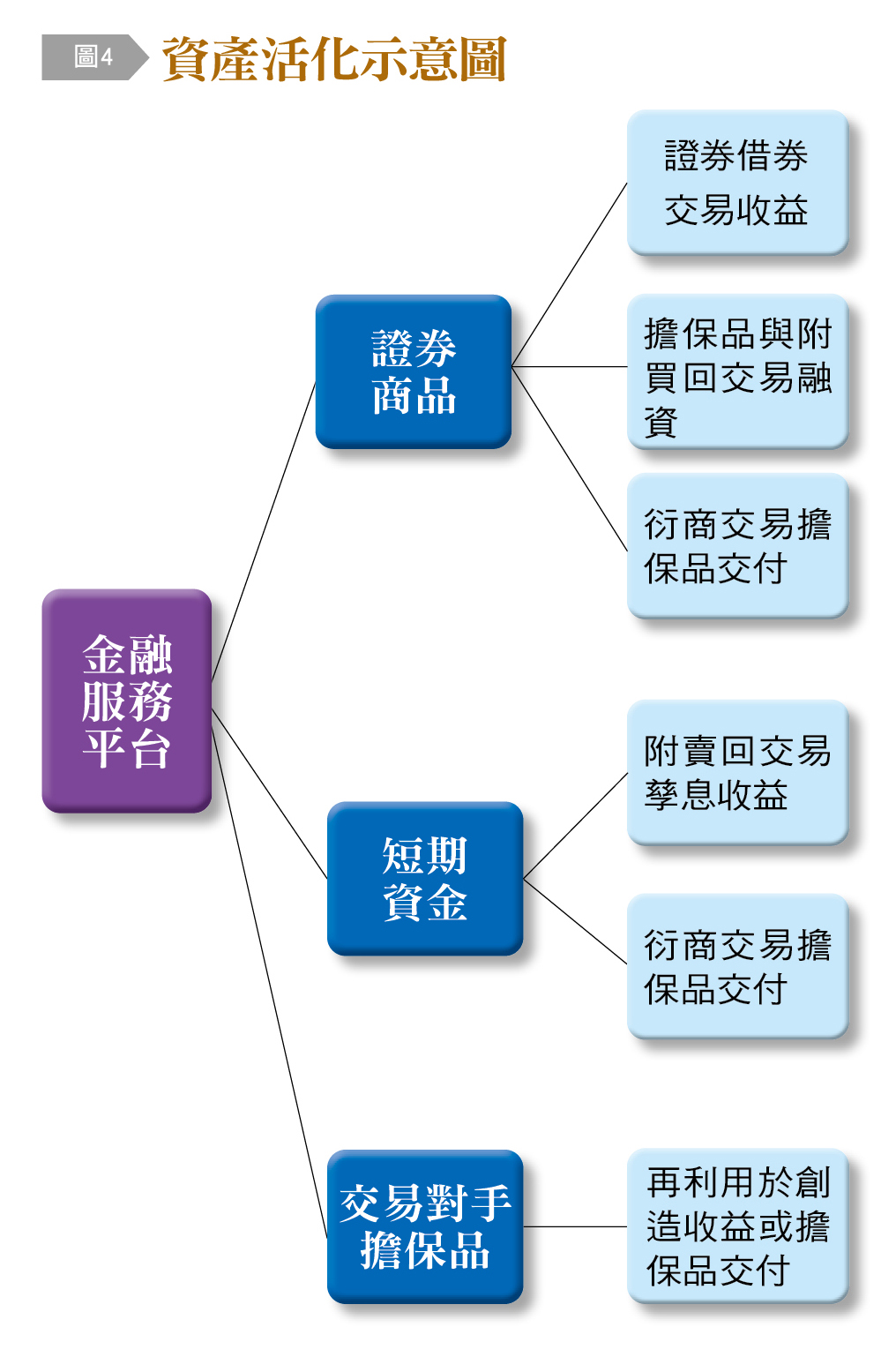 當國際金融環境日益複雜、波動遽增時,如何活化現有資產來創造額外收益、運用最低成本資產來作為擔保品與再利用交易對手交付的擔保品〔圖4〕,即是在制定風險配置和加速資料整合分析後的另一重要投資優化議題。但是國際交易網絡龐大、市場資訊繁瑣,甚至有不透明處,如要將此活化作業加諸在既有營運團隊,可想而知會是極沉重的人力管理負擔,也不盡然可以達到預期的效益。