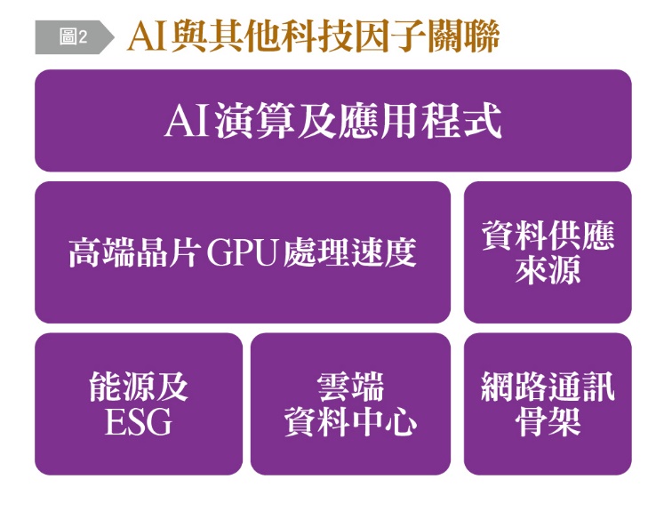 筆者無法對個別AI相關公司做評斷,但相信AI發展所必備的科技糧草[圖2]會隨著產業成長而蓬勃,這也是讀者可以考慮較為安全的相關投資布局,而不盲目只投入AI開發與應用公司。筆者也針對這些AI關鍵因素提供淺見,供參照如下: