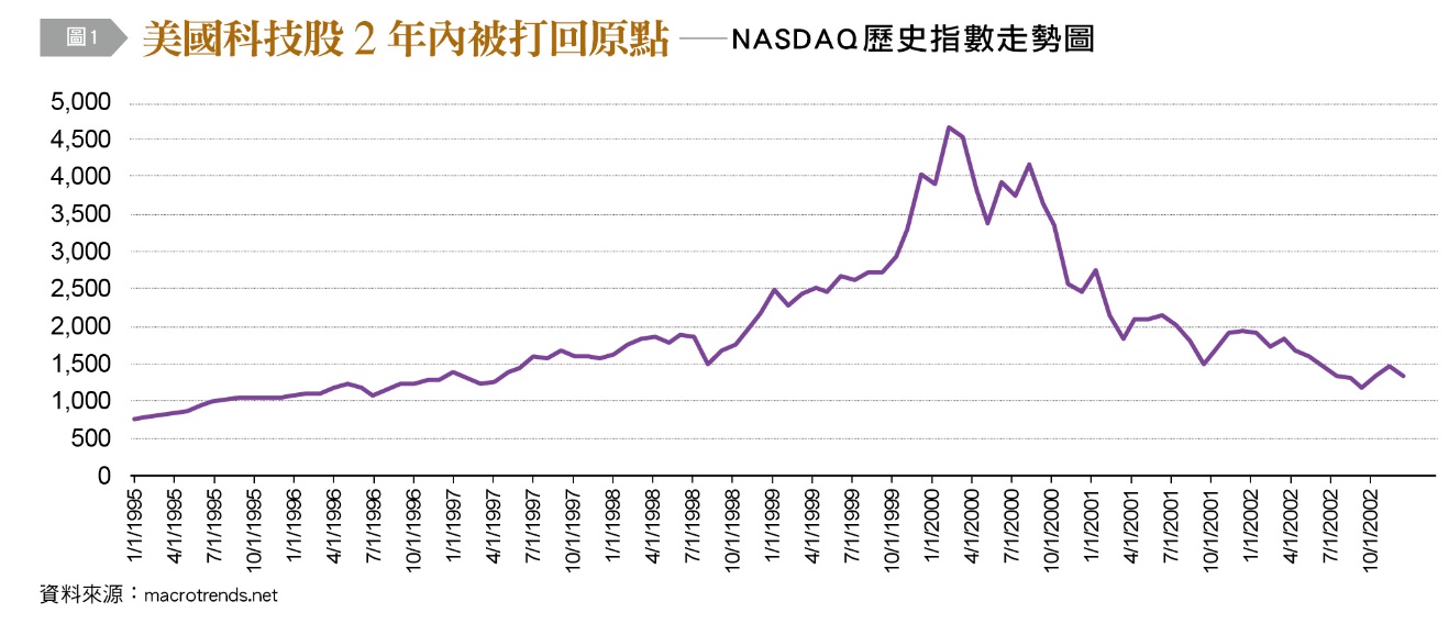 如網路泡沫時代,投資人自1995年瘋狂追逐.com相關股票,直至2000年一連串網路公司如Pets.com的倒閉,導致美國科技指數NASDAQ在2年內幾乎被打回原點[圖1],不難想見,在AI興起的時刻,市場必定會出現成千上萬的AI演算及應用公司集資。相信讀者們也對區塊鏈和加密貨幣記憶猶新,百家爭鳴中,還是不免會有劣幣加入及倒閉潮隨之而來。當然,新興AI科技是否會快速蓬勃發展,也取決於後續利率環境友善程度,以及主管機關相關法令規劃鬆緊態勢。