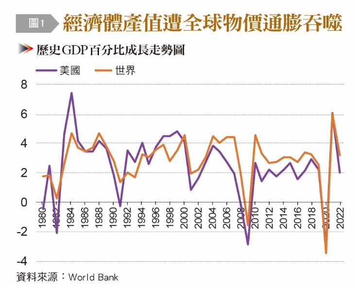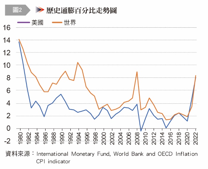雖然經濟學中,貨幣政策扮演一定管理通膨與經濟成長的角色,但筆者綜觀過去40年GDP成長[圖1]與通膨趨勢[圖2],除了美國的平均經濟成長(2.57%)較貼近平均通膨(3.32%),全球平均通膨(5.59%)還是遠高於平均經濟成長(2.95%),也顯示大部分經濟體的產值早被全球物價通膨所吞噬。當然,美國早年相對低通膨除了歸功於聯準會主席葛林斯潘任內(1987年至2006年)的漸進式利率政策,毫無疑問,在全球化自由貿易下的高競爭式生產與服務,也為美國經濟帶來一番消費榮景。所以,如何在貨幣、財政乃至國際貿易等政策找出合適搭配調節,方可平衡經濟成長與通膨之挑戰。