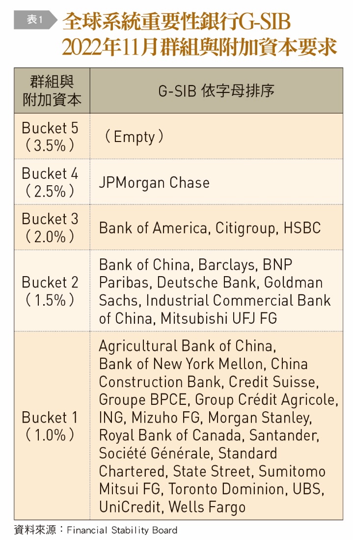 雖然公眾對金融機構的信心無法完全以資本衡量,但在法規和風險管理要求下,銀行必須具備一定資本適足率,而全球系統重要性銀行(G-SIB)更被要求額外的附加資本準備[表1]。當投資人都希望金融機構達到一定的股東回報率,又同時希望投資安全時,越大型的全球銀行也就面臨更高的資本需求,也進而影響其業務成本及服務定位之策略。