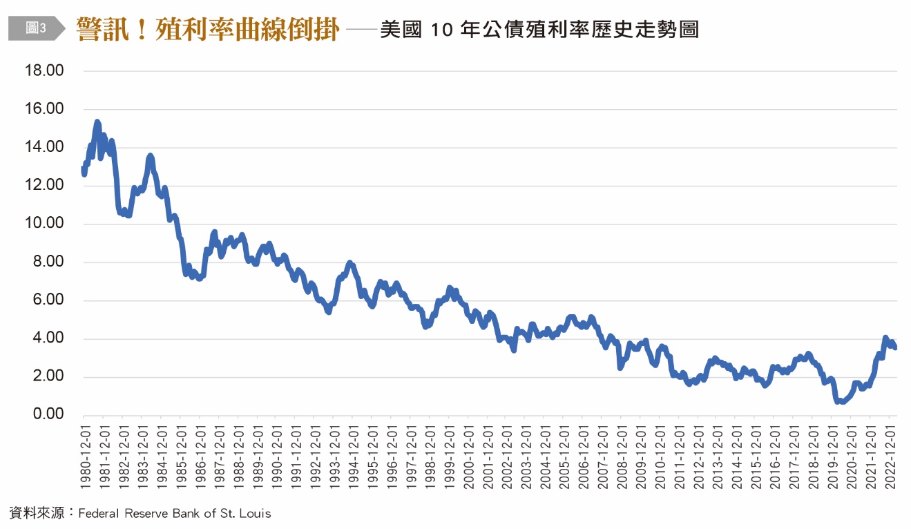 此次金融市場動盪,還是和近兩年聯準會激進升息有一定關係,當短天期利率因政策持續高漲,但美國10年公債走勢[圖3]因為經濟及通膨預期下放緩而造成殖利率曲線倒掛,相信持有龐大債券的金融業者已面臨一定金額的未實現虧損。面臨客戶的儲蓄擠兌時,銀行被迫出售已虧損債券來變現,虧損就需要入帳,帶來資本適足率下降,也再度觸發股價暴跌。金融體系的建立是在信用之上,而非單純地倚賴資本數字,所以目前的核心問題就是銀行信用遭受威脅和質問。