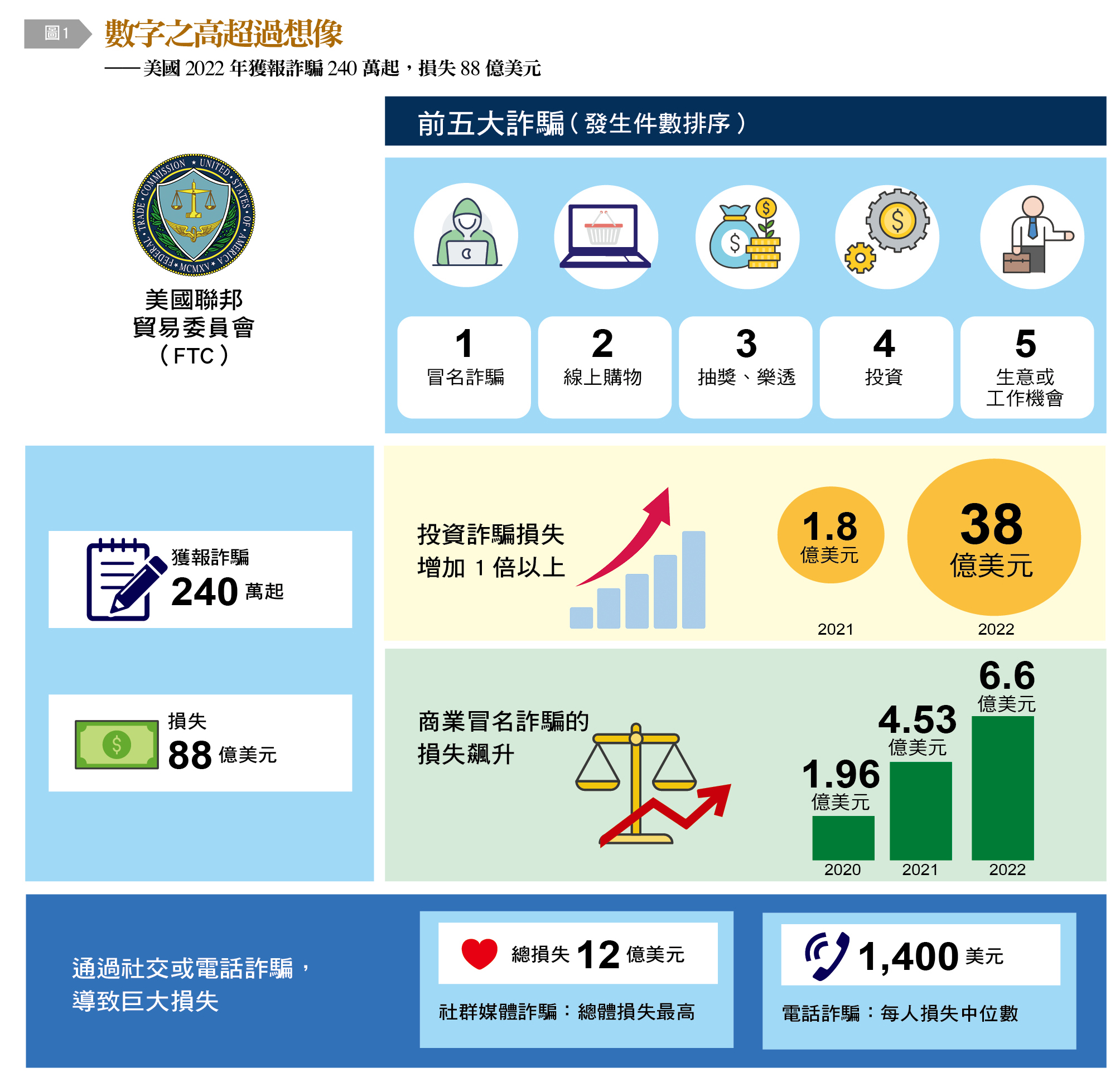 根據美國聯邦貿易委員會(FTC)最新統計,美國在2022年獲報的詐騙就有240萬起,損失88億美元,金額比上一年大增30%以上。其中光投資詐騙造成的損失超過38億美元最高,且金額超過2021年數字的2倍。而接獲報案的數量只是冰山一角,若加上自認倒楣沒有報案的,數字恐怕難以想像得高。