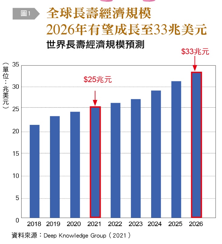 不久的未來,長壽產業規模將成為地球上最大的產業。根據顧問公司Deep Knowledge Group估計,2021年全球長壽經濟的規模達25兆美元,超過全球GDP(96兆美元)的四分之一,在2026年,全球長壽經濟的規模更會成長到33兆美元,屆時占比將更高[圖1]。