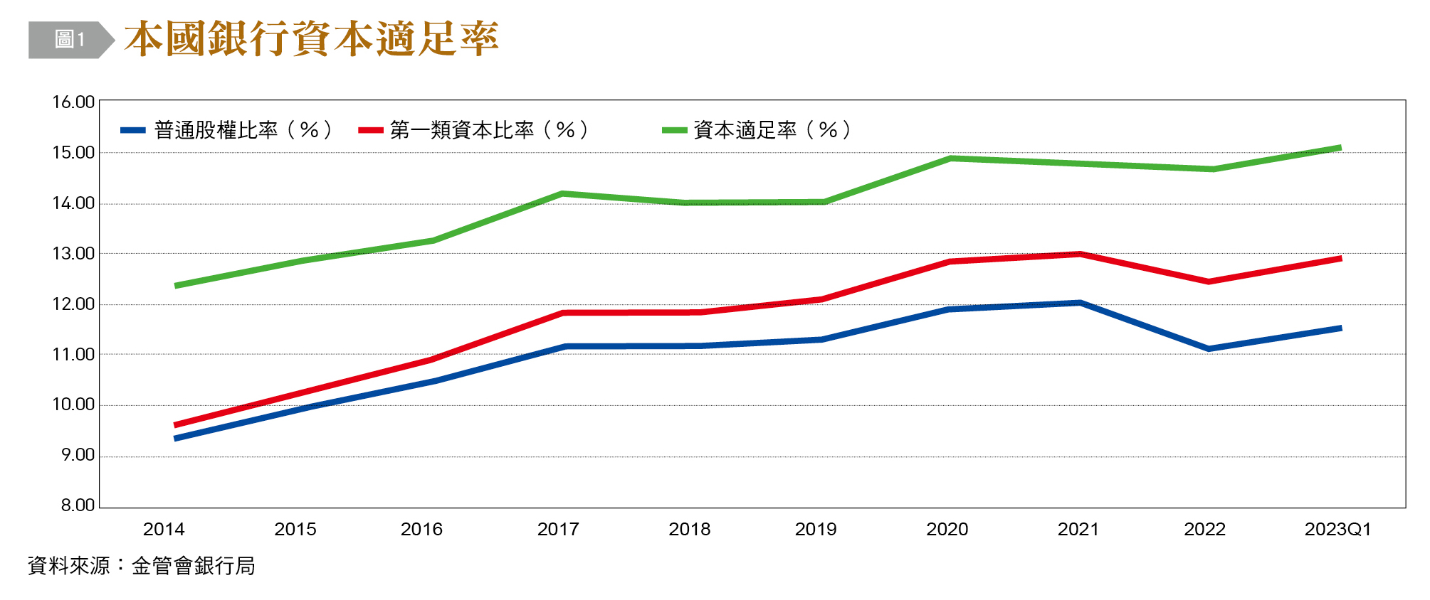 先就資本適足性與流動性觀察,為提升本國銀行資本之質與量以符合Basel III標準,金管會自2013年起逐年提高資本適足率的法定要求,自2019年起,普通股權益比率、第一類資本比率及資本適足率分別須達7%、8.5%及10.5%。截至2023年第一季底,本國銀行普通股權益比率、第一類資本比率及資本適足率已分別達11.55%、12.88%及15.08%,均高於法定標準,詳見〔圖1〕。且本國銀行在壓力情境下的平均資本適足率與槓桿比率也高於法定最低標準,顯示我國銀行業已具備一定之金融韌性。當然,金融體系也不能以此自滿,金管會在今年3月便指出今年首要工作是「提升金融穩定與韌性」,還把銀行監理壓力測試列為五大工作首位,規劃辦理今年度本國銀行監理壓力測試,藉以了解本國銀行的風險承擔能力。此外,根據中央銀行報告,本國銀行2022年平均流動性覆蓋比率及平均淨穩定資金比率分別為134.13%及138.41%,也遠高於法定標準100%,顯見整體流動性風險不高。