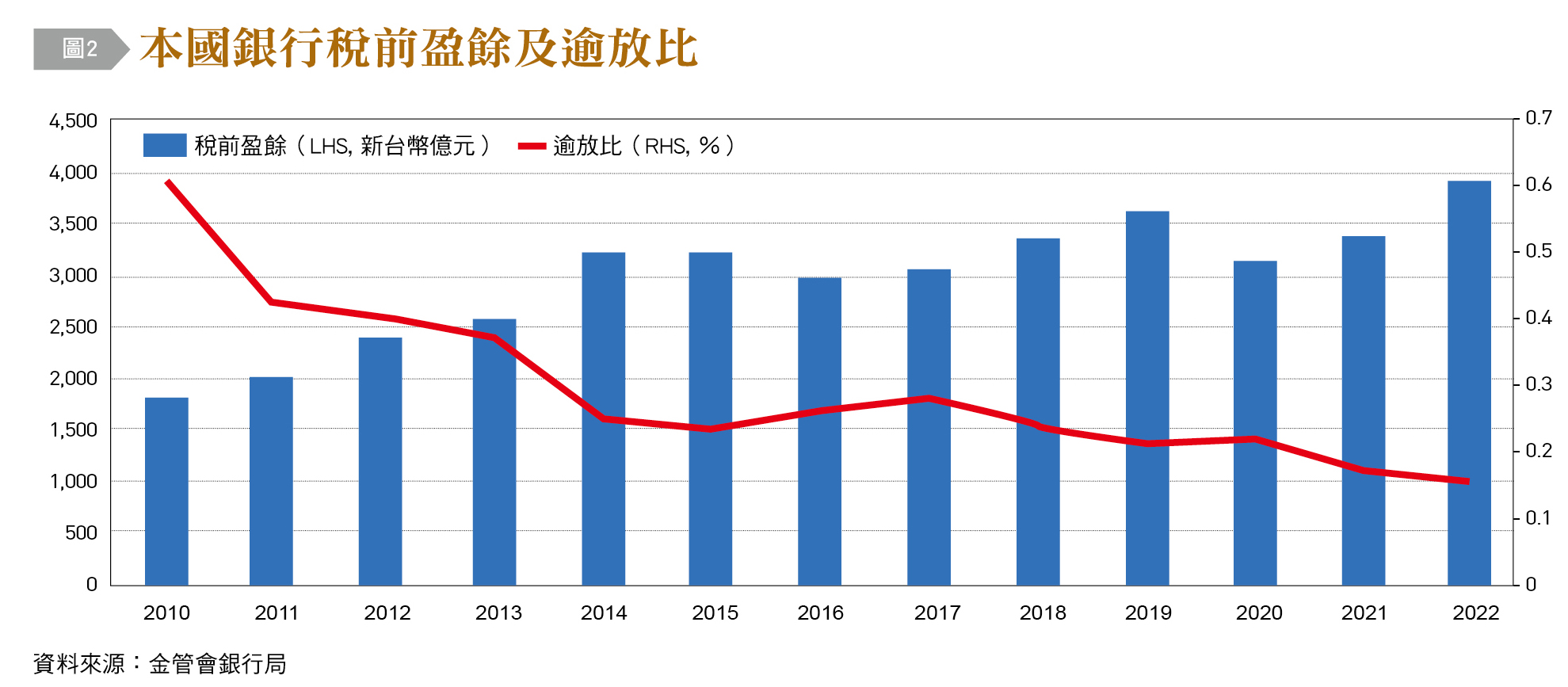 再看攸關銀行資產品質及抵禦風險能力的指標,近年本國銀行逾放比呈現逐年下降趨勢,2022年底僅為0.15%,可說繳出歷年最好成績,詳見〔圖2〕。獲利能力方面,2022年本國銀行稅前淨利約新台幣3,919億元,較2021年明顯增加逾500億元或15%,也創歷史新高,平均ROE及ROA亦分別由2021年的8.14%及0.58%上升至9.33%及0.62%。另金管會指定之中國信託、國泰世華、台北富邦、兆豐、合庫及一銀等六家系統性重要銀行,2022年底之資本適足率皆已達年底應符合之要求,顯示本國銀行整體財務穩健。
