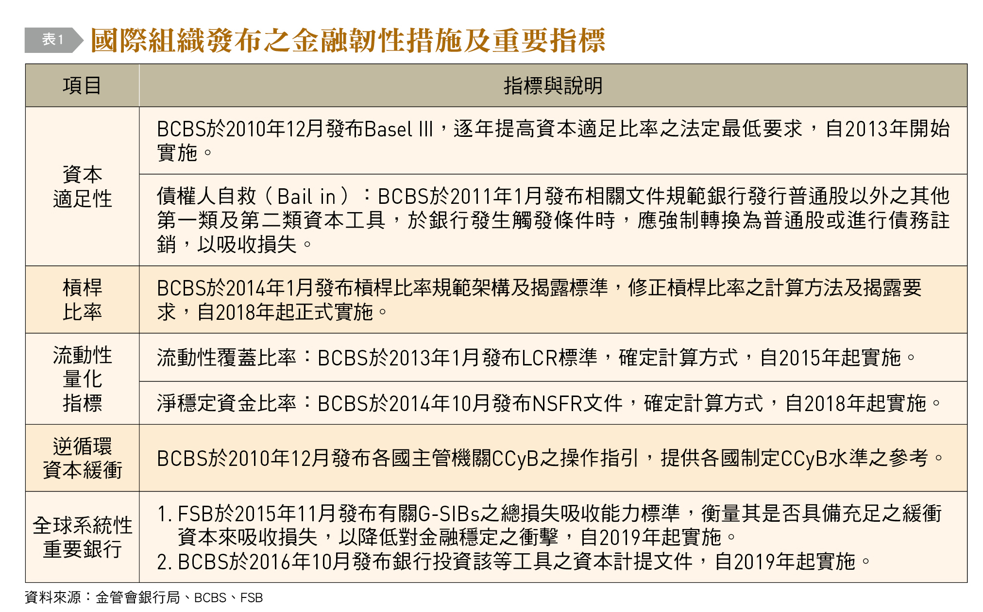 這些金融改革中,影響最廣泛也最深遠的,當然是國際金融監理組織訂出的規範了。為改善銀行體系承擔經濟及金融衝擊之能力,以提升其金融韌性,並促進金融市場穩定發展,巴塞爾委員會(Basel Committee on Banking Supervision, BCBS)做出更多強化監理的措施,其在2010年12月發布的Basel III,特別針對彌補金融體系的脆弱性(Vulnerabilities)問題,加強金融管制改革,例如要求提列資本保留緩衝(Capital Conservation Buffer)、逆循環資本緩衝(Countercyclical Capital Buffer, CCyB),以及後續增列流動性覆蓋比率(Liquidity Coverage Ratio, LCR)與淨穩定資金比率(Net Stable Funding Ratio, NSFR)等要求,希望減低金融機構管理者的代理問題(Agency Problem),化解「大到不能倒」現象。金融穩定委員會(Financial Stability Board, FSB)也開始建立詳細的監督制度,並導入多項的評估指標以衡量改革的效果。透過這些組織的合作,共同構建強化金融體系的韌性,詳如〔表1〕。