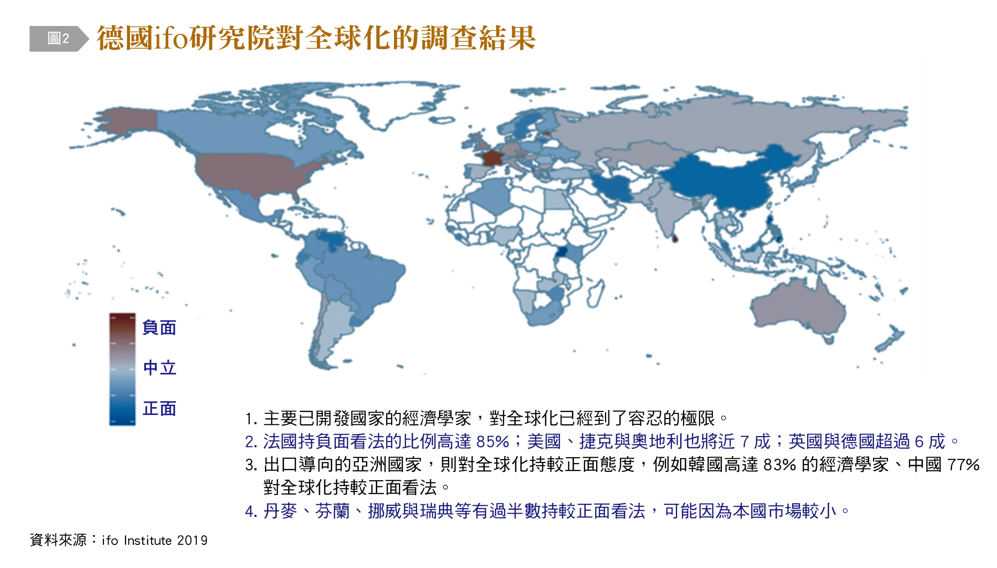 過去一百多年來全球化的程度起起伏伏,最近一波快速成長是在柏林圍牆倒塌與WTO的成立,但2008年的全球金融危機也放慢了全球化的步伐。德國著名的經濟研究機構ifo在2019年5月發表一份各國經濟學家對全球化態度的報告指出,主要已開發國家的經濟學家,對全球化已經到了容忍的極限(Reached the limit of acceptance)。該報告顯示,法國經濟學家對全球化持負面看法的比例高達85%;美國、捷克與奧地利也將近7成;英國與德國超過6成。但部分出口導向的亞洲國家,則對全球化持較正面態度,他們相信自己在全球分工中扮演世界工廠角色,他們的國家將受益於全球化。例如韓國高達83%、中國77%的經濟學家對全球化持較正面看法。該報告還有一個有趣的發現,那就是對全球化的態度竟然跟對中國的直接投資高度吻合,例如美國與歐盟對全球化持保留的國家,同時也對來自中國的直接投資持批判態度。德國等對於中國投資收購該國企業,進而取得高科技,頗有微詞,這也難怪在美中衝突升高之後,中國多次以全球化的捍衛者自居,指責美國破壞全球化。