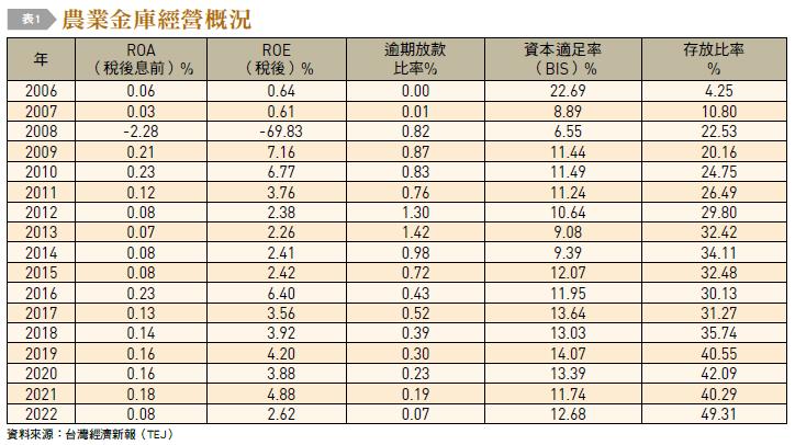 受到金融風暴衝擊後,農業金庫逐步調整資產結構,將資金運用於購買公債、公司債及長期股票投資等。由[表1]中可知,獲利性指標的資產報酬率(ROA)、淨值報酬率(ROE)除2008年因虧損分別為-2.28%、-69.83%,之後穩健成長;然其相對保守的經營,其獲利性較一般商業銀行偏低。農業金庫2022年資產報酬率與淨值報酬率分別為0.08%、2.62%;本國銀行則為0.64%、9.19%。代表資產品質的逾期放款比率,農業金庫除2013年為1.42%,2022年降為0.07%,資產品質佳,資本適足率2022年為12.68%。然近年面對美國升息,投資的債券部位評價損失,農業金庫今年亦辦理現金增資45億元,以提升資本適足率。