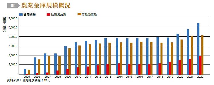 走過困境後,農業金庫逐步穩健發展,在規模性方面,資產總額由2005年底的1,181.8億元到2022年的10,932.6億元,成長9.3倍;貼現及放款從2005年底的30.7億元到2022年的4,047.9億元,成長132.0倍;存款及匯款從2005年底的955.7億元到2022年的8,327.8億元,成長8.7倍[圖1]。