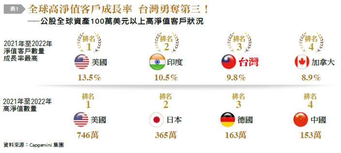 財富管理業務伴隨全球財富總額與富人客戶數持續增加,而日益受到各國政府重視,根據Capgemini集團提供的研究報告指出,2021至2022年全球前4個地區高淨值客戶成長率最高的為美國、印度、台灣、加拿大等[表1],而勤業眾信《2023年銀行與資本市場展望》中指出,全球財富管理資產持續增加,高淨值家庭(HNWHs)客戶數至2026年預計達5,200萬戶;其中亞太地區擁有更大量的富裕家庭(Affluent house holds),至2023年預計達3.5億戶。