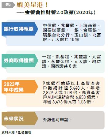 在亞洲地區,香港及新加坡除了較早開始推行財管業務的優勢外,「前面有人做過、政府沒有說不的都能做」的海洋法系特點,讓這兩個國家在資產管理業務承作彈性上,比起依循大陸法系的台灣來得有優勢,不過金管會先前相當有遠見,提早推出「媲美星港」財管2.0政策[表2],就是看準這樣的商機能為台灣金融業帶來新機會點,而幾年前香港實施《國安法》後逐漸內地化,國際財富管理大行核心業務因地緣政治,部分外商銀行退出亞洲市場,香港也流失不少客戶,這正是台灣該積極拓展的一塊寶地。