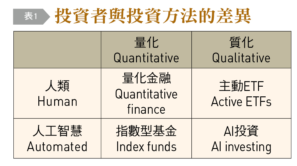 另一方面,人工智慧真正的獨特之處,並非能夠從輸入資訊中找到更有用的見解,而是能夠幾乎毫無限制地輸入各種類型的資料,並將其統合。之前的統計方法通常可以處理市場價格這種結構化資料,卻對自然語言、影片這類非結構化的資訊毫無辦法;即便有一些前處理(Pre-processing)技術,也會剝奪資料中的一些有用資訊。因此它適合進行質性投資,而非量化投資。投資者與投資方法的差異,可以成為[表1]的2×2矩陣: