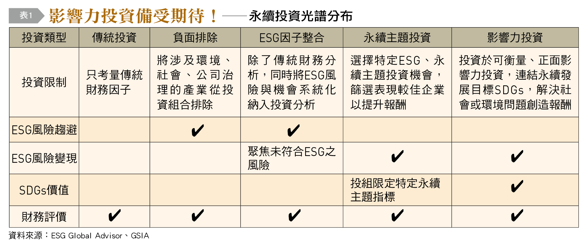 影響力投資在永續投資光譜分布上屬於深永續領域[見表1],金融市場投資從傳統的財務投資,在過去十幾年裡開始有「少作惡、不作惡」的ESG風險衡量思維,這幾年則發展永續主題投資,近來更進軍考量ESG風險變現、連結聯合國永續發展目標,同時不忽略財務評價等綜合衡量的影響力投資,為防止漂綠爭議,具備可衡量指標工具、可被認證的影響力投資,未來發展空間備受期待。