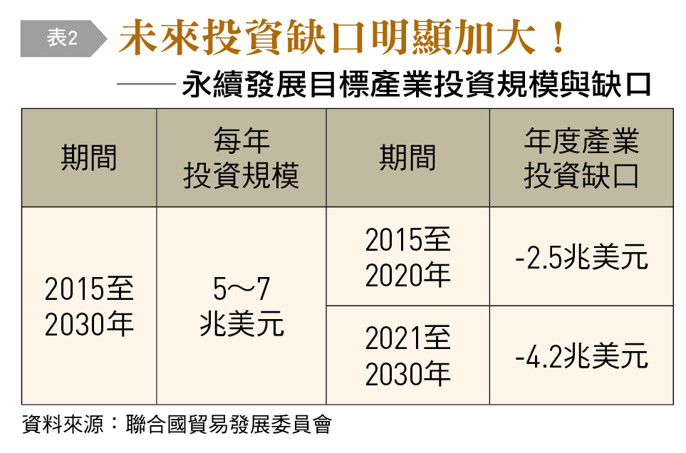 根據聯合國貿易發展委員會估計,若全球要在2030年達到永續發展目標,預估每年投入的金額在5至7兆美元,2015年至2020年的年度產業投資缺口約2.5兆美元,不過受到疫情影響,2021年至2030年的產業投資缺口約4.2兆美元[見表2],在全球投入實現永續目標的努力下,預期未來幾年達成永續發展目標的投資速度與金額將加快且加大。