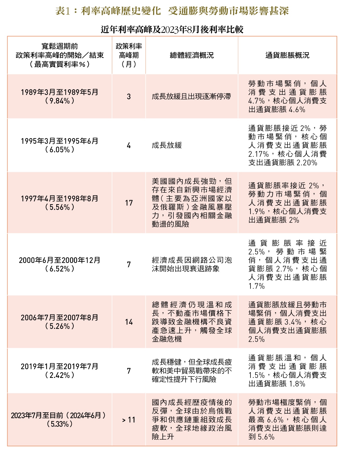 若定義利率高峰為一系列升息到頂峰之後到初次降息之前,﹝表1﹞臚列美國最近40年的多次利率高峰及目前假設已達利率高峰的資料為比較。第一欄列出寬鬆週期前最高實質聯邦資金利率(Effective Federal Fund Rate)到達高峰的開始及結束時間,與這段期間最高實質利率。第二欄為高利率時期長度,第三及第四欄則簡述了當時經濟與通貨膨脹狀況,特別是在高峰時以總體和核心個人消費支出通貨膨脹(Personal Consumption Expenditures, PCE)價格指數年度變化的百分比,這也是聯邦儲備理事會(Fed)較為偏好的政策衡量指標。利率高峰歷史變化相當一致地受到通貨膨脹預期和勞動市場狀態的影響。經濟成長放緩與否,似乎並不是美國央行體系利率政策的主要考量,控制通貨膨脹幾可謂為決策最重要的方向。