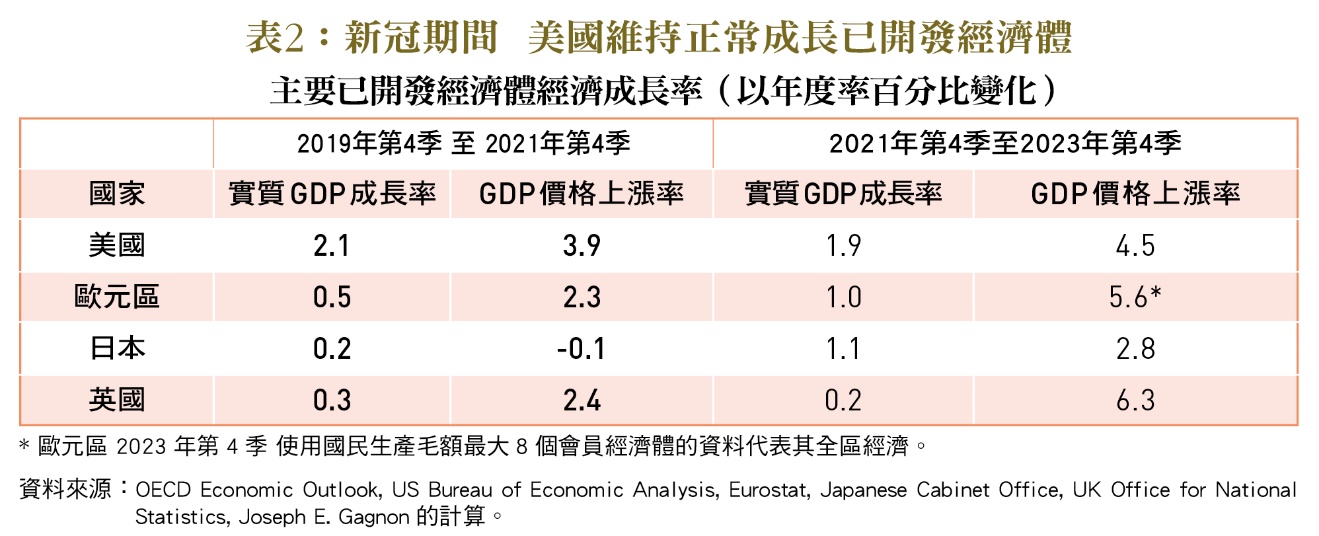 觀察各國通貨膨脹率以及產出的變化,可發現過去幾年,從量價齊漲轉變為量跌價升,根據上述的分析邏輯,各國面臨的不只是供應鏈負面衝擊,還需處理需求面上升的壓力,歐美央行體系採取緊縮的貨幣政策,並非不合理。﹝表2﹞比較了主要已開發經濟體的通膨和經濟成長率,以及國內生產毛額價格變化。由於後者包括出口到其他國家的商品和服務,但不包括進口產品,故更能衡量國內價格的變化。2019年到2021年的數字顯示了新冠肺炎流行較為嚴重的8季,美國較其他國家地區有更強的經濟成長,也是唯一在此期間尚能維持正常成長的已開發經濟體,但此乃以高通貨膨脹率為代價。歐元區和英國的經濟成長疲軟,唯通貨膨脹接近目標。而日本的經濟不僅疲軟,通貨膨脹更遠低於目標,僅為0.5%。但由俄羅斯入侵烏克蘭開始的8季,這些經濟體都經歷了物價上漲加速,日本通貨膨脹僅略高於目標的2%,歐美各國卻淪為高通膨的災區,只是美國經濟成長,考慮通貨膨脹之後損害較為輕緩,表現仍尚可。歐元區和日本的經濟成長雖相當接近,但物價上漲速度卻幾乎是日本的2倍。英國在此期間不僅經濟表現墊底,通膨率還較其他經濟體為高。當需求對物價上漲產生加速作用的情況下,提高政策利率成為不得不的選擇。此外,中央銀行需要看到對預期通貨膨脹做出反應,以防止預期在擬訂工資和物價決策中變得根深柢固。