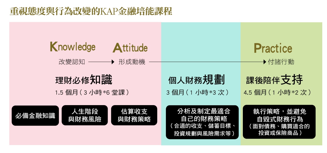 本課程基於金研院的KAP(知識、態度、行為)教學模式,分為3個階段:第一階段是團體課程,學員學習如何理解投資、儲蓄、保險等基本概念;第二階段是一對一的財務輔導,由CFP理財規劃顧問個別指導學員制定財務策略;最後,第三階段的陪伴支持,提供實戰式的跟進與支持,幫助學員在財務規劃上持續前進,解決實際遇到的難題。