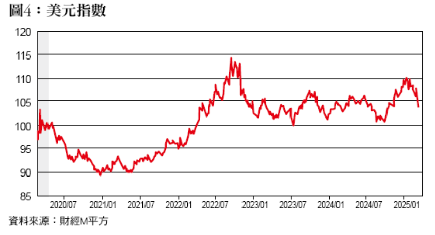 雖然川普上任後提出了不少具有政治魄力的政策,但民眾的看法也相當兩極,支持者認為改革招致罵名在所難免,也認為這些政策有助於減少開支來緩和財政壓力。然而,反對者卻認為部分政策(例如:對等關稅)雖然表面上增加了政府關稅收入,但實際上卻可能讓進口商轉嫁關稅到民眾身上,形成了物價上漲的壓力,這對最近一年來好不容易平穩的美國物價,又形成了一種暗潮洶湧的態勢,美元指數也在2024年中的上升趨勢下開始回落,反映出美國經濟安全另一層面的問題。