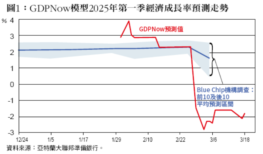 確實,股市是經濟櫥窗,近期美國陸續公布一些經濟數據,表現普遍不如預期,甚至急速惡化,或許已經透露出些許端倪。其中,最受到眾人關注的,無非就是亞特蘭大聯邦準備銀行發布的2025年第一季即時經濟預測數字(GDPNow,參見圖1),季增年率直接從原本2.32%(2025年2月26日預測值),急墜至-2.82%(2025年3月3日預測值)。短短不到一個禮拜時間,經濟預測快速從成長到衰退,落差超過5個百分點,也難怪市場會高度擔憂經濟衰退的到來。