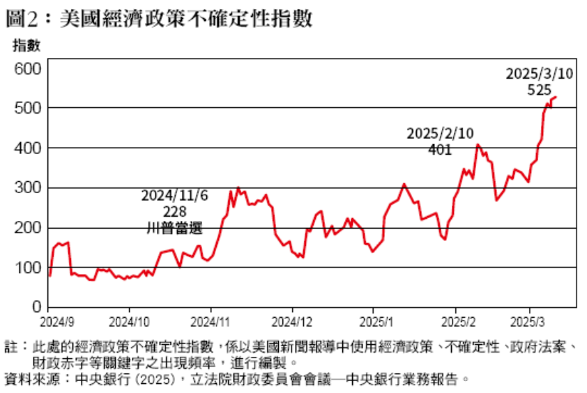﹝圖2﹞列出美國經濟政策不確定性指數走勢,可以看到自川普當選以來,雖然以美國利益為優先的政策方向相當明確,但諸多經貿政策的推出顯得有些急就章,且內部存在高度分歧意見,加上施行細節並未清楚揭露,連帶也造成美國經濟政策不確定性持續攀高。迄2025年3月10日止,此指數已來到近期新高的525。