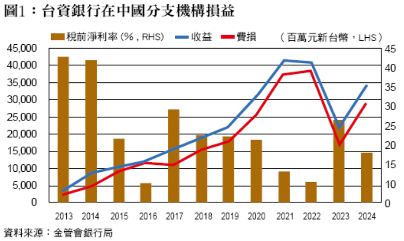 尤其隨著中國經營環境的不斷緊縮與惡化,加上對岸希望金融服務實體經濟的大政策思維,整體金融業的獲利日益萎縮,台資銀行在中國分支機構的稅前淨利率也大致呈現下滑趨勢,詳如〔圖1〕。在營收端不斷萎縮的當下,又面臨各種稅費、罰款或法遵等相關經營成本的不斷提高,可能削弱未來獲利能力,令人憂心的是,除了一般產業外,台資銀行在對岸的經營條件也將迎來持續的緊縮與惡化。