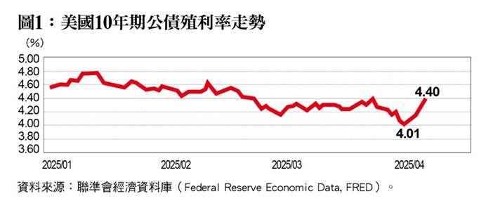 這波關稅大戰衝擊層面不只股市與經濟,美債市場也大受波及。﹝圖1﹞列出美國10年期公債殖利率走勢,從圖中可以看到,美國10年期公債殖利率原本隨著聯準會降息循環啟動,趨勢逐步往下,但自對等關稅措施出爐後,美國10年期公債殖利率立刻從4月4日低點4.01%,大幅彈升至4月10日的4.4%。短短一個禮拜左右時間,上漲幅度高達39個基點,頗有一舉扭轉原本下跌趨勢的味道。