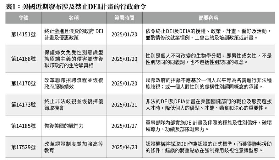 而涉及禁止DEI計畫的行政命令相當多,其中第14151號行政命令指出,過去幾乎每個聯邦機構都有提交「公平行動計畫」(Equity Action Plans),命令中不僅說明這些DEI計畫滲透聯邦政府的方式,並表明此為龐大的公共浪費,並要求主責機關評估且定期報告前政府的DEI、DEIA及環境正義計畫,與相關政策的營運影響及成本。而第14168號則是強調,由於「性別意識型態」是以不斷變化的自我評估性別認同概念,取代生物學上生理性別類別,造成允許男性可以認同自己是女性而成為女性的錯誤說法,並要求社會所有機構將這種錯誤的說法視為真實;甚至在第14185號認為,與個人生理性別不同的虛假性別認同,無法滿足軍隊的嚴格標準,更破壞領導力及凝聚力,從而削弱軍隊的戰備能力。