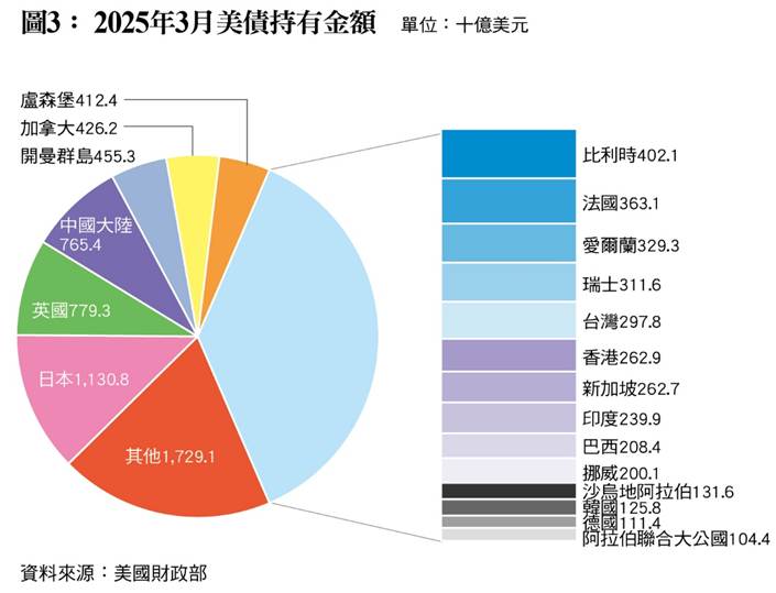 雖然,目前美國主權信用評等遭降的影響似乎不大,但是不失為一記警鐘,畢竟仍在沸沸揚揚的關稅協議、大規模減稅法案等事件,都可能會對美國財政與經濟造成重大的影響,持續的政治經濟紛擾,恐怕也會逐漸影響全球投資機構對美國的信心。中國自2000年起大量購入美債,甚至在2008年至2019年間成為美國最大的海外債權國,但是根據統計,目前,中國的美債持有量已從2011年的最大值減少了接近一半,並且於2025年3月被英國超越,成為美國第三大債權國,彷彿對美國投下不信任票。日本、英國和中國目前是持有美債數量最多的前三大經濟體,儘管他們肯定不樂見美債價值崩落,而影響外匯儲備的價值,但手中持有的美債也可能成為與美國各種談判上的籌碼之一,影響市場的穩定性。