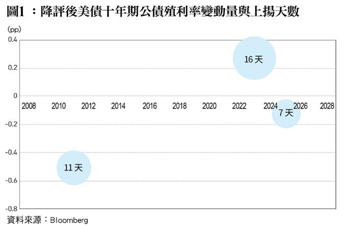 從投資美國國債的金融機構來說,依據國際清算銀行(BIS)巴塞爾協議(Basel III),AAA至AA-的主權債券風險權重皆設定為0,使得金融機構基於監理法規而拋售AA+等級美債的機率變得微乎其微。事實上,標普、惠譽及穆迪調降評等後,美債殖利率也沒有因為大量拋售而出現顯著且持久的上揚。標普公布美債降評的30個工作天後,10年期公債殖利率下降了0.51個百分點,30個工作天當中,共11天的殖利率較前一天上揚;惠譽公布美債降評的30個工作天後,10年期公債殖利率上揚了0.26個百分點,共16天的殖利率較前一天上揚;穆迪公布美債降評的18個工作天後,10年期公債殖利率下降了0.12個百分點,共7天的殖利率較前一天上揚,如﹝圖1﹞所示,顯示美債作為避險標的的地位,並未因為降評而受到動搖。