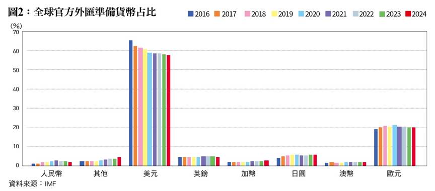 那麼,美元在全球支付系統的地位是否有可能受到挑戰,進而削弱美債的價值呢?從貨幣的三大功能:保值、交易與計價來看,相較於維持強勢美元,近期美國政府對於貿易逆差國的幣值似乎更加在意。另外,除了俄羅斯、中國大幅減持美元資產,世界各國以美元資產作為外匯準備的數量也有下滑趨勢,如﹝圖2﹞所示。以各國外匯準備占比來看,歐元、英鎊、日圓,甚至人民幣、加幣、澳幣,可能是最有機會挑戰美元地位的貨幣,但他們的發行規模都遠不如美元,恐怕無法充分應付全球交易需求。此外,作為全球主要結算貨幣,必定會因為大量的需求而導致貨幣升值,進而喪失出口競爭力,恐怕不是以經濟成長為重的政府所樂意見到的事,因此美元在全球貨幣中的優勢地位,在短期內仍看不到改變的可能。