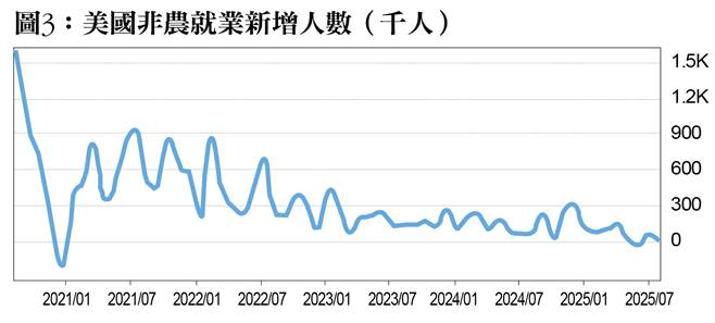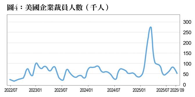 相較之下,勞動市場的疲態更為明顯。根據新修正的數據顯示(美國勞工統計局剛在9月9日將2024年4月至2025年3月的非農就業數據向下修正91.1萬人,創下有紀錄以來最大下修規模),2025年至8月為止,平均每月的非農就業人數僅增加7.4萬人,遠低於過去3年的37.9萬人、21.6萬人及16.7萬人,顯示勞動市場在川普上任之前即已逐漸走疲,尤其2025年以來的走勢似乎更為疲弱。即使即將公布的美國第3季經濟成長率可能維持在3%以上,但近期勞動市場轉弱跡象越來越明顯,有「小非農」之稱的民間版ADP就業數據(ADP National Employment Report, ADP),9月份民間聘雇人數意外減少3.2萬人,降幅是兩年半來最大。另外,根據人力資源機構Challenger, Gray & Christmas公布9月美國企業裁員人數約5.4萬人,雖然裁員情況出現緩和,但2025年前3季裁員人數仍創5年來同期新高。若再考量川普政府威脅聯邦政府關門將導致數十萬聯邦員工面臨失業風險,短期內就業數據恐難讓人感到樂觀。
