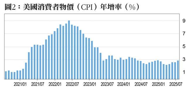 首先,聯準會的雙重目標,通膨與就業,從這次貨幣政策會後新聞稿來看,已明顯由抑制通膨轉為支持就業。畢竟,關稅對物價上漲衝擊不似原先評估的那樣嚴重,雖然短時間通膨數據仍將緩步墊高,但並不會回到2022年的高峰,那時消費者物價(CPI)年增率高達9.1%,消費者支出(PCE)物價年增率也高達7.2%。從8月CPI年增率僅2.9%,PCE年增率也只2.7%觀之,即使未來幾個月關稅效應逐漸顯現,估計通膨約略只會比3%高一點,尚屬於可容忍的範圍內,不至於讓聯準會採取升息的緊縮性貨幣政策。