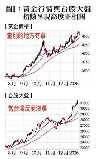 我們可以觀察金融市場的反應。當別的地方有事的時候,我們可以理解為地緣政治風險上升,於是市場避險情緒上升,有助於推高黃金的行情;同時,台灣反而沒事,意思是台灣所面對的地緣政治風險反而有所緩和,這會表現在台股大盤的走高。﹝圖1﹞正好呈現這一點,就是黃金的行情與台股大盤指數果然出現統計上的高度正相關。